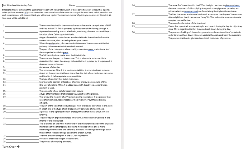 I have also developed a low stakes retrieval vocabulary quiz that I give toward the end of each unit. In AP Biology, this quiz is composed of 30 definitions. Students have 10 minutes to complete the quiz. Initially, students are not provided a word bank, and I instruct students to use a pencil. Every correct vocabulary term the write in pencil is worth 2 points. When students feel like they’ve answered as many questions as they can without a word bank they come up to my desk and trade in their pencil for a colorful pen and I hand them a word bank that contains all the vocabulary in the unit. Students return to their seat, and continue the quiz, now with the word bank. Any words they write in pen are worth 1 point. The maximum possible points a student could receive are 60 (if they did not need the word bank at all). However, when I calculate their grade, I calculate it out of 45 and then ultimately convert it to a 10-point formative assessment grade (minimal in the gradebook). Any student who scores over 45 points receives a 10/10.