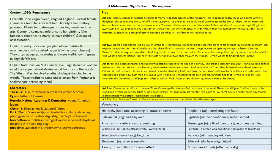 According to the book Make it Stick, “one of the best habits to instill in a learner is regular self-quizzing” (1). I give my students self-quizzing revision homework from Year 7 (6th Grade). This activity is knowledge-based and informed by the contents of a knowledge organizer provided for them. For example (see below), on a Shakespeare scheme studying A Midsummer Night’s Dream, they are given a summary of the plot, key characters, important contextual information and key vocabulary (this is what Joe Kirby refers to as ‘core knowledge’).