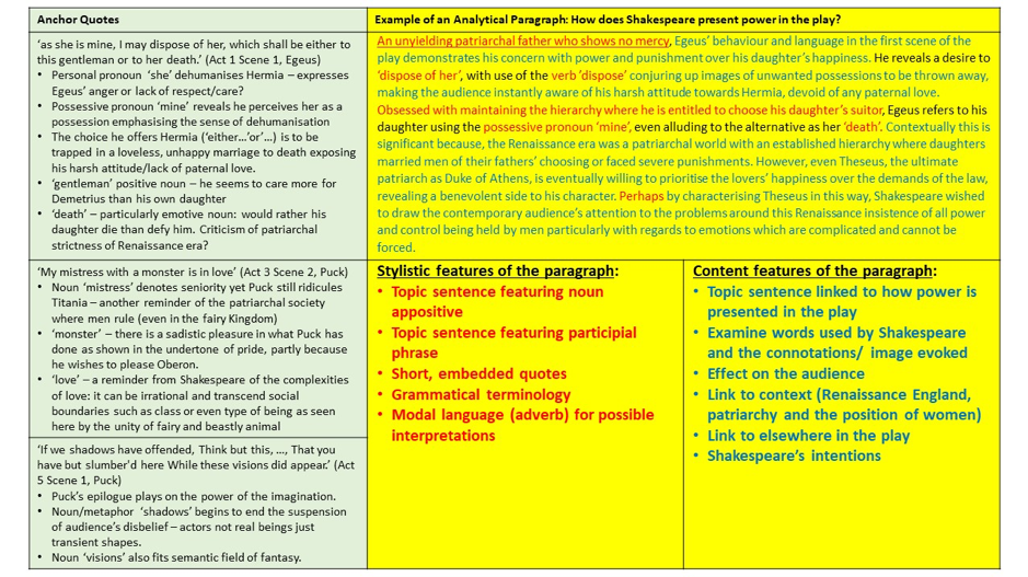 The next strategy is the use of Concrete Examples. To train students up in this study method, I provided a concrete example of an analytical paragraph based on the idea of power in A Midsummer Night’s Dream. Underneath the paragraph is a broken-down list of content and stylistic criteria that has been used in the example to make it both successful and sophisticated.