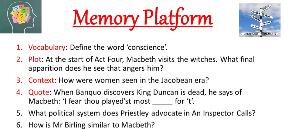 I also use Andy Tharby’s excellent memory platforms at the beginning of each lesson to interleave their practice of different concepts in one quick retrieval practice session, through the following structure:
